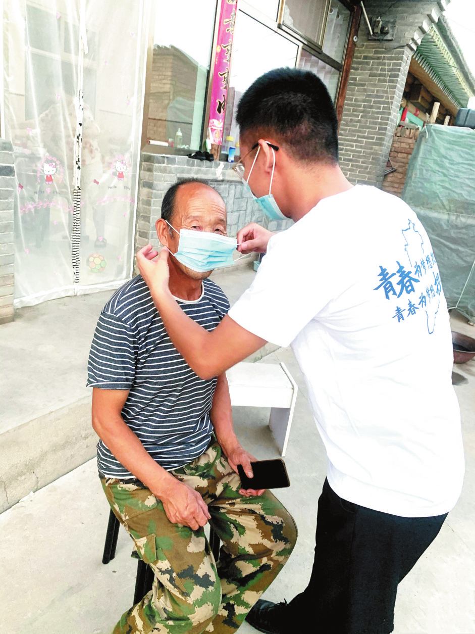 健康生活,鄉(xiāng)村有我。圖為建行忻州分行青年員工深入農(nóng)村教村民正確佩戴口罩,增強防疫意識。 (朱 敏 攝)