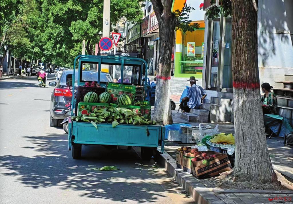 近日,記者在城區(qū)多條街巷發(fā)現(xiàn),大多數(shù)商販都能守法經(jīng)營,整齊有序擺放商品。然而,仍有個別商販占道經(jīng)營,對市容環(huán)境造成影響。圖為7月7日上午,城區(qū)氣象北巷一家蔬菜店把蔬菜擺放在門前的人行道上、把拉運(yùn)玉米的三輪車停放在馬路上叫賣,玉米皮隨地亂扔,嚴(yán)重妨礙了通行秩序。(記者張志遠(yuǎn)攝)