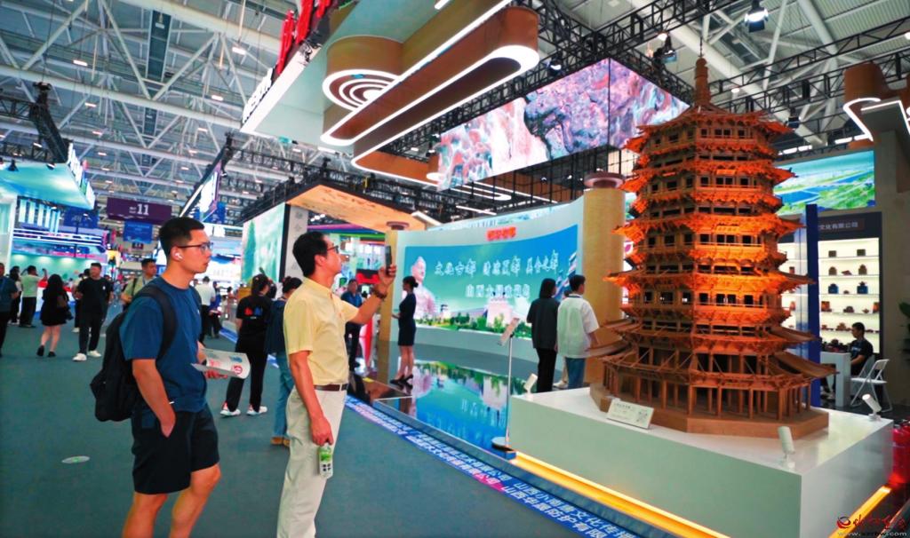 山西晟龍木雕模型藝術(shù)有限公司制作的應(yīng)縣木塔模型一亮相,便吸引了眾多觀展游客的目光。精美絕倫的造型引得人們嘖嘖稱奇,紛紛拿出手機(jī)拍照記錄分享。該模型高約3米,最大直徑1.9米,通過20∶1的比例微縮打造,復(fù)刻了應(yīng)縣木塔的榫卯結(jié)構(gòu),其內(nèi)部樓梯扶手清晰可見,門窗都能打開?!拔覀兊倪@件展品,是由二十多個師傅經(jīng)過半年多的時間完成的。這次為了來深圳參展,我們專門把它從定襄裝運(yùn)發(fā)車,用了整整兩天半的時間才送到,跨越了將近兩千公里。”該公司總經(jīng)理張艷峰告訴記者。