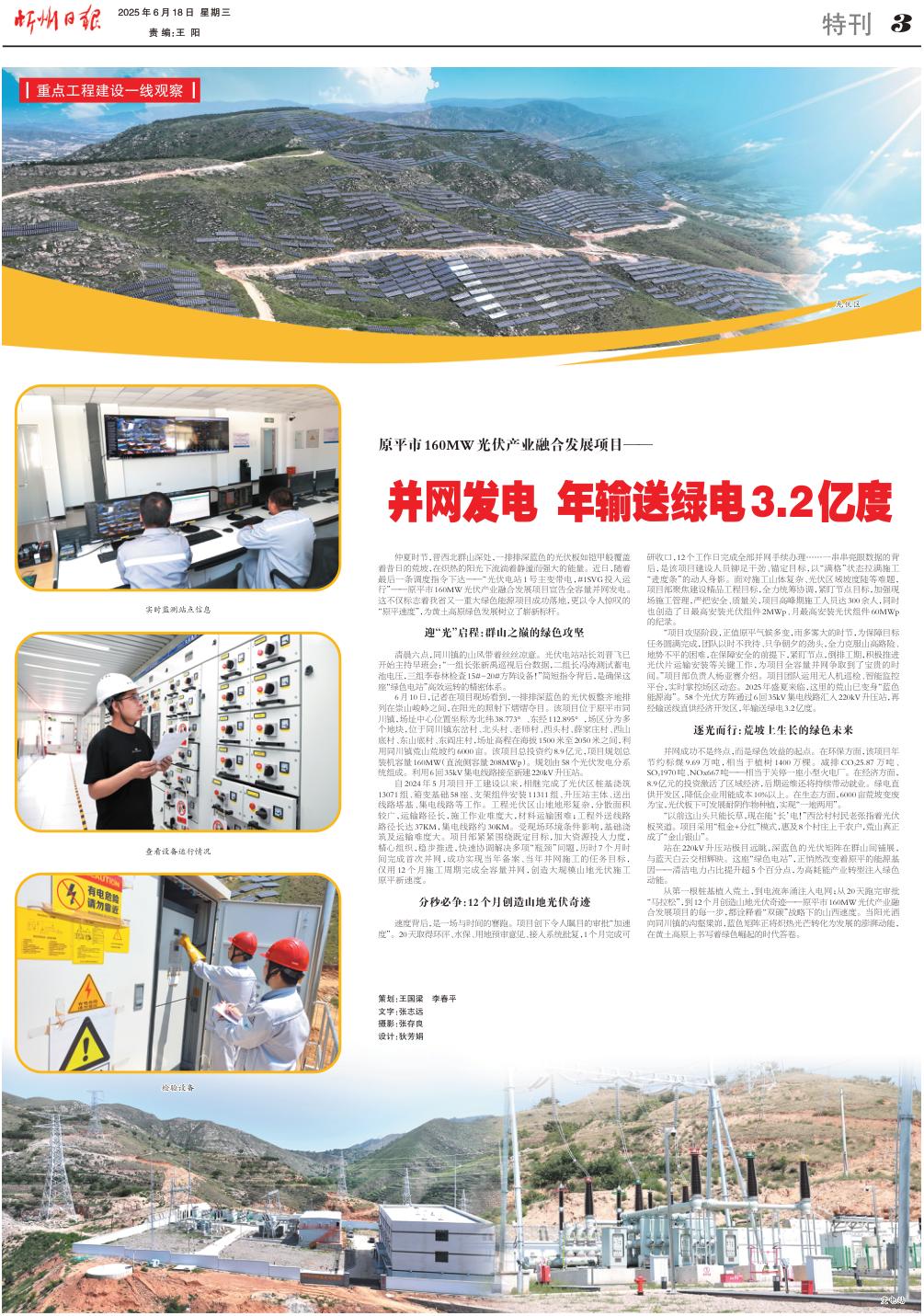 仲夏時節(jié),晉西北群山深處,一排排深藍(lán)色的光伏板如鎧甲般覆蓋著昔日的荒坡,在熾熱的陽光下流淌著靜謐而強(qiáng)大的能量。近日,隨著最后一條調(diào)度指令下達(dá)——“光伏電站1號主變帶電,#1SVG投入運(yùn)行”——原平市160MW光伏產(chǎn)業(yè)融合發(fā)展項(xiàng)目宣告全容量并網(wǎng)發(fā)電。這不僅標(biāo)志著我省又一重大綠色能源項(xiàng)目成功落地,更以令人驚嘆的“原平速度”,為黃土高原綠色發(fā)展樹立了嶄新標(biāo)桿。