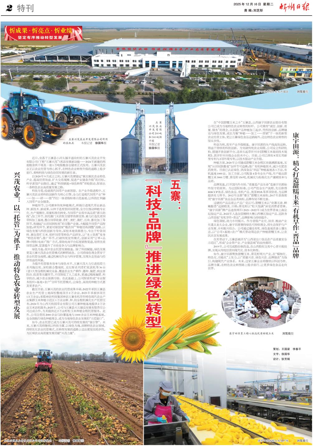 在“中國(guó)甜糯玉米之鄉(xiāng)”五寨縣,山西康宇田源農(nóng)業(yè)股份有限公司已成為當(dāng)?shù)靥厣r(nóng)業(yè)轉(zhuǎn)型的標(biāo)桿。公司秉持“誠(chéng)信、創(chuàng)新、質(zhì)量、服務(wù)”的理念,從農(nóng)副產(chǎn)品種植加工起步,憑科技創(chuàng)新、品牌建設(shè)與綠色發(fā)展,成長(zhǎng)為集“種植——加工——營(yíng)銷”于一體的新型農(nóng)業(yè)經(jīng)營(yíng)主體,更讓五寨綠色食品遠(yuǎn)銷海外,邁出特色農(nóng)業(yè)轉(zhuǎn)型的堅(jiān)實(shí)步伐。