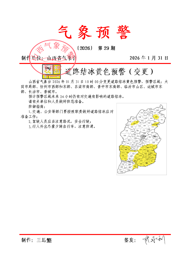 山西省氣象臺(tái)2026年01月31日10時(shí)00分變更道路結(jié)冰黃色預(yù)警,預(yù)警區(qū)域:大同市局部、忻州市西部和東部、呂梁市南部、晉中市東南部、臨汾市山區(qū)、運(yùn)城市東部、長治市、晉城市。預(yù)計(jì)預(yù)警區(qū)域未來24小時(shí)仍有對(duì)交通有影響的道路結(jié)冰。請(qǐng)有關(guān)單位和人員做好防范準(zhǔn)備。防御指南:1.交通、公安等部門要按照職責(zé)做好道路結(jié)冰應(yīng)對(duì)準(zhǔn)備工作;2.駕駛?cè)藛T應(yīng)當(dāng)注意路況,安全行駛;3.行人外出盡量少騎自行車,注意防滑。