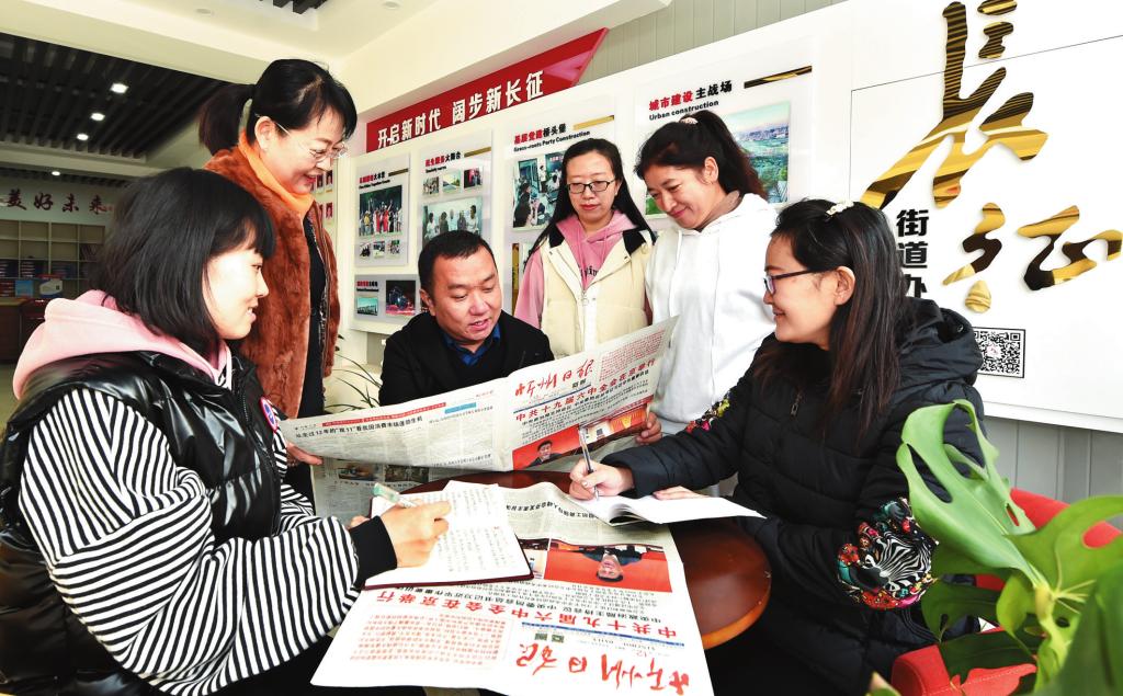 忻府區(qū)長(zhǎng)征街街道辦事處和平東街社區(qū)工作人員認(rèn)真學(xué)習(xí)十九屆六中全會(huì)精神。馮曉磊 攝