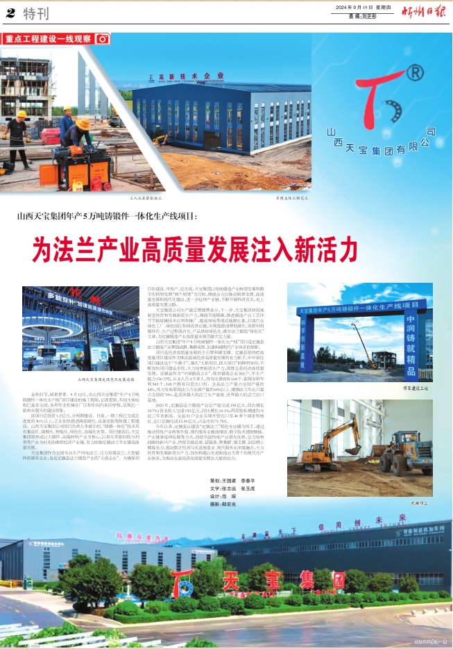 天寶集團(tuán)作為全國(guó)專業(yè)生產(chǎn)風(fēng)電法蘭、壓力容器法蘭、大型鍛件的領(lǐng)軍企業(yè),也是定襄縣法蘭鍛造產(chǎn)業(yè)的“頭部企業(yè)”。為確保項(xiàng)目快建設(shè)、早投產(chǎn)、見實(shí)效,天寶集團(tuán)以傳統(tǒng)鍛造產(chǎn)業(yè)轉(zhuǎn)型發(fā)展和數(shù)字化轉(zhuǎn)型發(fā)展“兩個(gè)轉(zhuǎn)型”為目標(biāo),圍繞全方位推動(dòng)轉(zhuǎn)型發(fā)展、高質(zhì)量發(fā)展和現(xiàn)代化建設(shè),進(jìn)一步延伸產(chǎn)業(yè)鏈,不斷開展科研攻關(guān),走上高質(zhì)量發(fā)展之路。