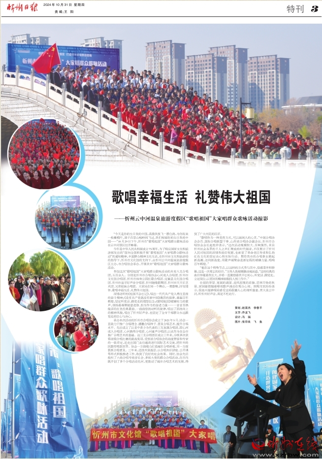 今年是中華人民共和國成立75周年,為了響應(yīng)國家文化和旅游部發(fā)出的“面向全國積極開展‘歌唱祖國’大家唱群眾歌詠活動(dòng)”的通知精神,豐富群眾精神文化生活,在忻州市文化和旅游局的指導(dǎo)下,忻州市文化館的支持下,由忻州云中河溫泉旅游度假區(qū)主辦,市合唱協(xié)會(huì)承辦,開展我市“歌唱祖國”大家唱群眾歌詠活動(dòng)。