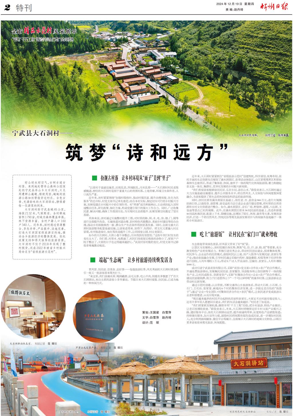 好山好水好空氣,古樹古道古村落。來到地處管涔山森林公園深處的寧武縣涔山鄉(xiāng)大石洞村,只見周遭群山巍峨、植被茂密,蜿蜒的旅游公路如絲帶般穿過村莊。古色古香、充滿韻味的大石洞驛站,靜候著每一位游客的到來。 大石洞村距寧武縣城45公里,海拔2132米,氣候寒涼。全村耕地面積1790畝,村域內(nèi)森林覆蓋率高,林下資源豐富。全村戶籍人口160戶340人。近年來,該村通過資源整合、多態(tài)并舉、產(chǎn)品提升、設(shè)施完善,打造大石洞國(guó)家級(jí)旅游目的地,推動(dòng)全鄉(xiāng)旅游經(jīng)濟(jì)的整體發(fā)展。依托政策支持和得天獨(dú)厚的旅游資源,大石洞村不僅于2018年實(shí)現(xiàn)了整村脫貧,還在2022年被省鄉(xiāng)村振興局命名為“省級(jí)旅游示范村”。 ■ 扮靚古村落 讓鄉(xiāng)村環(huán)境從“面子”美到“里子” “以前村子基礎(chǔ)設(shè)施差,垃圾亂丟,環(huán)境臟亂,污水亂排……”大石洞村村民老陳感慨道,曾經(jīng)的大石洞村是囿于重重大山的貧困村落,土地貧瘠,環(huán)境衛(wèi)生條件差,人口流失嚴(yán)重。 近年來,該村緊緊圍繞“加強(qiáng)村級(jí)組織、推動(dòng)村強(qiáng)民富、提升治理效能、優(yōu)化為民服務(wù)”的總目標(biāo),村黨支部書記率先垂范,結(jié)合本村實(shí)際,制定切實(shí)可行的鄉(xiāng)村振興方案,發(fā)揮黨建在鄉(xiāng)村振興中的引領(lǐng)作用。村“兩委”成員積極響應(yīng),主動(dòng)承擔(dān)起人居環(huán)境整治任務(wù),研究政策、細(xì)化方案,形成黨建引領(lǐng)下的強(qiáng)大工作合力。同時(shí),廣泛收集民意、解決問題,確保工作落到實(shí)處,為實(shí)現(xiàn)村莊品質(zhì)提升、拓展發(fā)展空間奠定了堅(jiān)實(shí)基礎(chǔ)。 具體來說,該村通過實(shí)施整村提升工程,對(duì)村里的路、網(wǎng)、水、電、房、墻、門、廁等進(jìn)行全面提升改造。實(shí)施綠道河道治理、農(nóng)村特色風(fēng)貌整治、美麗鄉(xiāng)村建設(shè)等綜合治理,推動(dòng)鄉(xiāng)村面貌煥然一新、群眾生產(chǎn)生活條件得到顯著改善。同時(shí),全面完善大石洞村旅游服務(wù)配套基礎(chǔ)設(shè)施,讓游客進(jìn)得來、容得下、玩得好。將文化元素融入村莊景觀,有序推進(jìn)綠化、亮化等改造提升工作,讓田園變公園、村莊變景區(qū)。 如今的大石洞村,大街小巷干凈整潔,污水得到有效管控。“這些年我們村發(fā)生的變化太大了。你們看,村里水、電都通了,村民們房前屋后堆放的雜物少了,家家戶戶院子整潔了,大家的日子也過得越來越舒心?!闭劶按迦荽迕驳淖兓?,村黨支部書記薛俊青難掩激動(dòng)地說。 ■ 端起“生態(tài)碗” 讓鄉(xiāng)村旅游持續(xù)煥發(fā)活力 賞風(fēng)景、住民宿、嘗美食、品好茶……每逢旅游旺季,風(fēng)光秀麗的大石洞村便會(huì)吸引一批又一批游客前來觀光打卡。 “來這里,我們游滴水洞、喝洞藏酒、品毛尖茶、吃山羊肉,別提有多愜意了!”在大石洞驛站,來自太原的游客小李笑著說。節(jié)假日來大石洞村度假、住民宿,已成為她的一種休閑方式。 近年來,大石洞村緊緊抓住“省級(jí)旅游示范村”創(chuàng)建契機(jī),科學(xué)謀劃、統(tǒng)籌布局,依托豐富的生態(tài)資源先后規(guī)劃了滴水洞景區(qū)、農(nóng)事活動(dòng)體驗(yàn)區(qū)、山區(qū)景觀觀賞區(qū)和原始森林生態(tài)康養(yǎng)區(qū),形成了集體驗(yàn)、休閑、康養(yǎng)于一體的現(xiàn)代化休閑旅游園,著力構(gòu)建起農(nóng)文旅一體化、集群化、差異化發(fā)展的鄉(xiāng)村振興新局面。 “我們希望游客能夠宿在民居、樂在鄉(xiāng)間、游在山水。”薛俊青表示,大石洞村通過大力實(shí)施基礎(chǔ)設(shè)施建設(shè)、提升公共服務(wù)水平,將自然風(fēng)光、人文體驗(yàn)與休閑度假深度融合,為游客提供了原生態(tài)的休閑體驗(yàn)和舒適的旅游環(huán)境。 同時(shí),該村在原有滴水洞景區(qū)基礎(chǔ)上,依托省、市、縣資金900萬元,進(jìn)行大規(guī)模招商引資,以誰投資、誰管理、誰受益的方法引進(jìn)企業(yè)進(jìn)行建設(shè)管理,將村里的自然資源和鄉(xiāng)村文化資源進(jìn)行整合。如今,滴水洞景區(qū)、音樂廣場(chǎng)、野豬林、道觀、八仙洞、玉皇廟等景點(diǎn)已初具規(guī)模。此外,在滴水洞景區(qū)原本30間民宿的基礎(chǔ)上,改造和新建50間高標(biāo)準(zhǔn)民宿,配套上下水、取暖設(shè)施,還增加了娛樂、休閑、康養(yǎng)等元素,發(fā)展夜游經(jīng)濟(jì),打造一個(gè)將自然風(fēng)光、傳統(tǒng)民俗等觀光旅游發(fā)展項(xiàng)目與休閑康養(yǎng)基地融于一體的鄉(xiāng)村旅游區(qū)。 ■ 吃上“旅游飯” 讓村民在“家門口”就業(yè)增收 生態(tài)修復(fù)帶來綠色美景,好風(fēng)景又帶來了好“錢”景。 以景區(qū)為發(fā)展核心,該村挖掘自身優(yōu)勢(shì),聚焦“吃、住、行、游、購(gòu)、娛”等要素,充分激發(fā)特色產(chǎn)業(yè)的發(fā)展活力。積極引進(jìn)優(yōu)秀企業(yè),帶動(dòng)村民創(chuàng)業(yè)就業(yè),探索集體統(tǒng)籌、村民參與、企業(yè)運(yùn)作的經(jīng)營(yíng)模式,鼓勵(lì)村民以土地、房產(chǎn)入股參與發(fā)展民宿、農(nóng)家樂等產(chǎn)業(yè);推動(dòng)農(nóng)旅融合