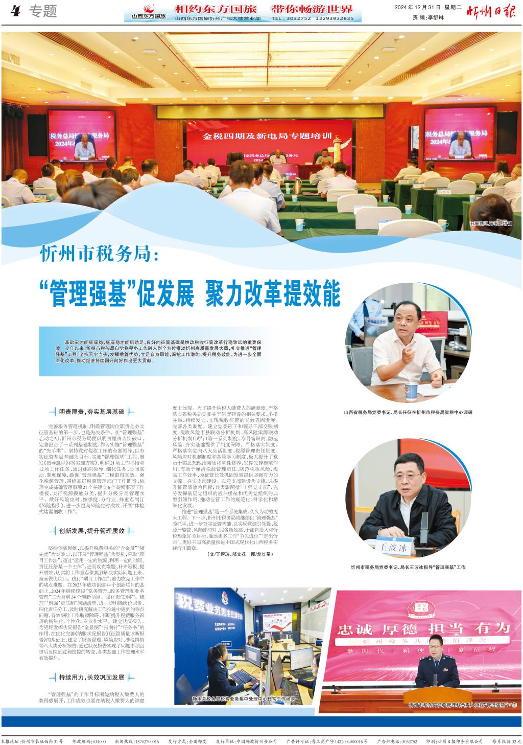 基礎(chǔ)牢才能底座穩(wěn),底座穩(wěn)才能后勁足,良好的征管基礎(chǔ)是推動(dòng)稅收征管改革行穩(wěn)致遠(yuǎn)的重要保障。今年以來,忻州市稅務(wù)局自覺將稅務(wù)工作融入到全方位推動(dòng)忻州高質(zhì)量發(fā)展大局,扎實(shí)推進(jìn)“管理強(qiáng)基”工程,堅(jiān)持干字當(dāng)頭,發(fā)揮垂管優(yōu)勢,立足自身職能,深挖工作潛能,提升稅務(wù)效能,為進(jìn)一步全面深化改革、推動(dòng)經(jīng)濟(jì)持續(xù)回升向好作出更大貢獻(xiàn)。