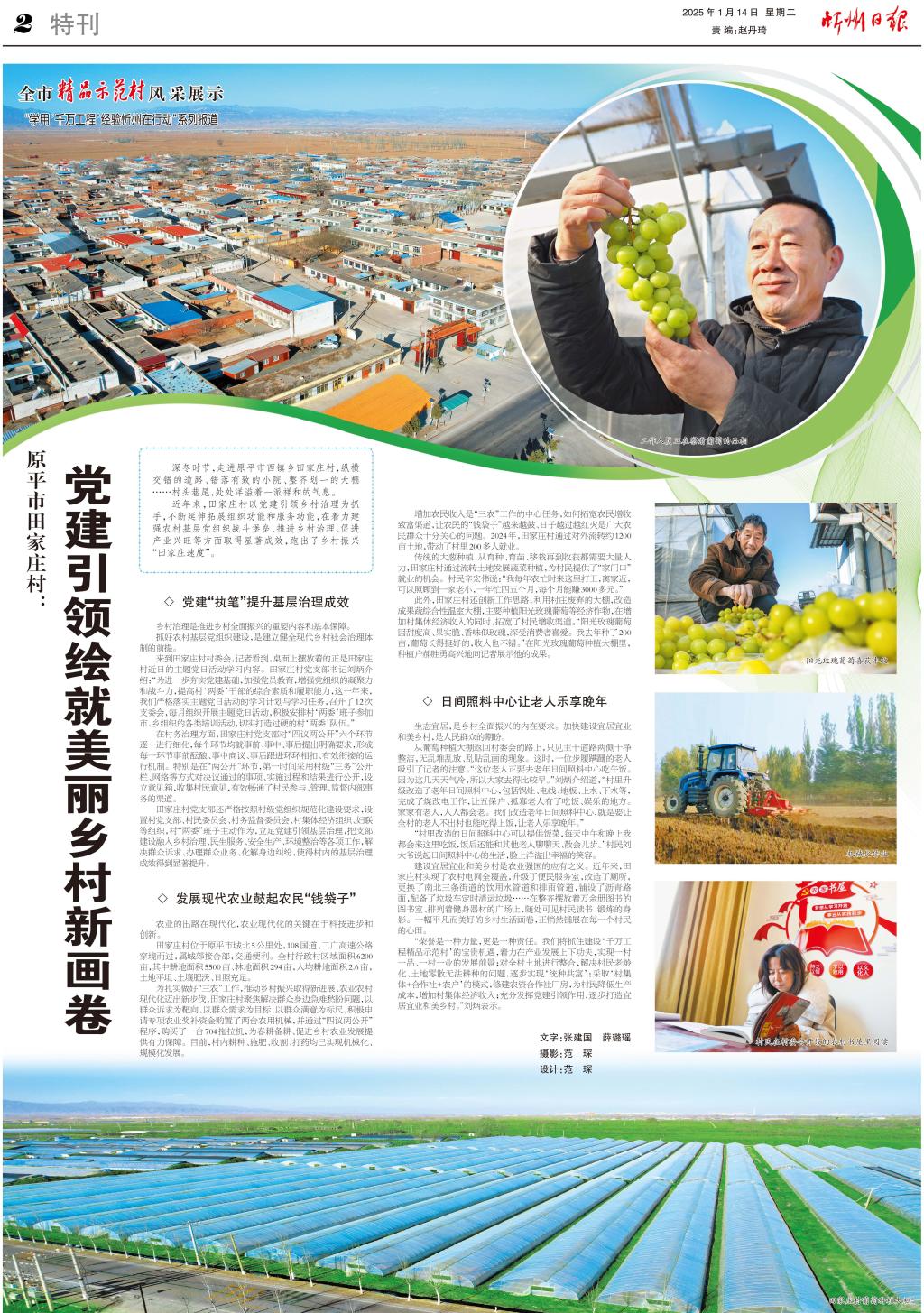 此外,田家莊村還創(chuàng)新工作思路,利用村莊廢棄的大棚,改造成果蔬綜合性溫室大棚,主要種植陽光玫瑰葡萄等經(jīng)濟(jì)作物,在增加村集體經(jīng)濟(jì)收入的同時(shí),拓寬了村民增收渠道?!瓣柟饷倒迤咸岩蛱鸲雀摺⒐麑?shí)脆、香味似玫瑰,深受消費(fèi)者喜愛。我去年種了200畝,葡萄長(zhǎng)得挺好的,收入也不錯(cuò)?!痹陉柟饷倒迤咸逊N植大棚里,種植戶郝勝勇高興地向記者展示他的成果。