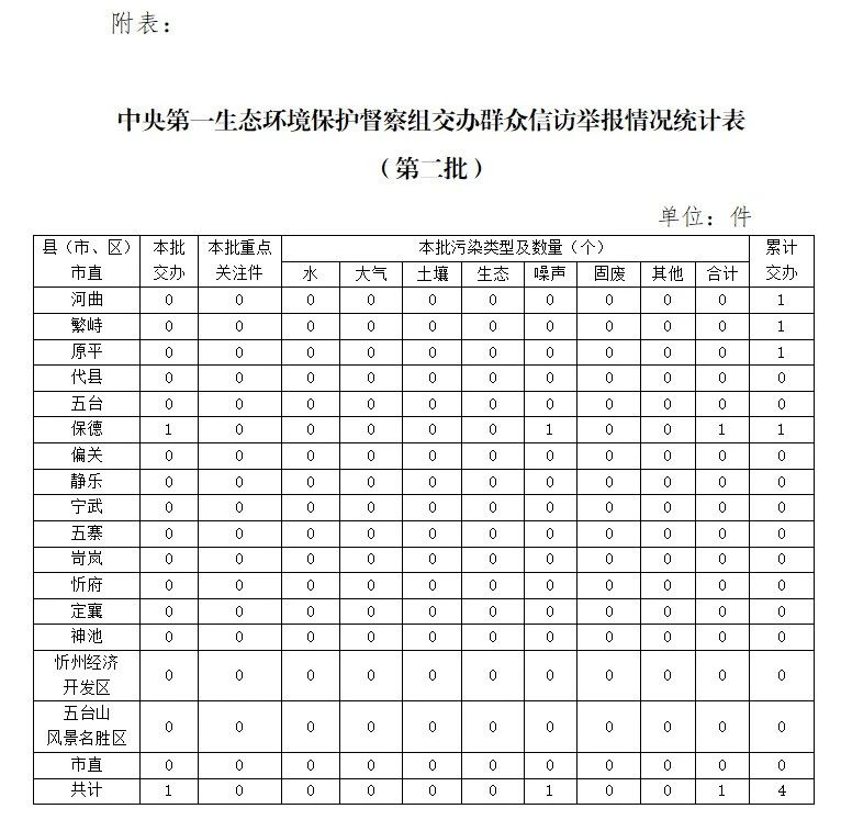 截至5月30日,中央第一生態(tài)環(huán)境保護(hù)督察組累計(jì)向我市交辦信訪件4件,其中重點(diǎn)關(guān)注件0件。交辦的信訪件中,涉及原平市1件、河曲縣1件、繁峙縣1件、保德縣1件;涉及生態(tài)環(huán)境問題4個,其中水污染問題1個、大氣污染問題1個、生態(tài)破壞問題1個、噪聲污染問題1個。