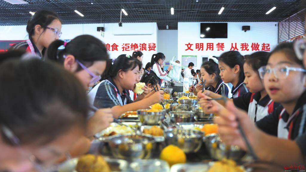 走進長城小學,1535.25平方米的校內(nèi)餐廳里,900余名師生在老師引導下有序取餐、就餐,餐盤里葷素搭配的飯菜色香味俱全,孩子們的臉上滿是笑意?!耙郧鞍謰尮ぷ髅Γ颐刻斓米\噥砘嘏?,現(xiàn)在有了午托太幸福了!午餐每天不重樣,有肉有湯,比媽媽做得還香!”六年級學生李宸慶捧著飯菜笑著說。
