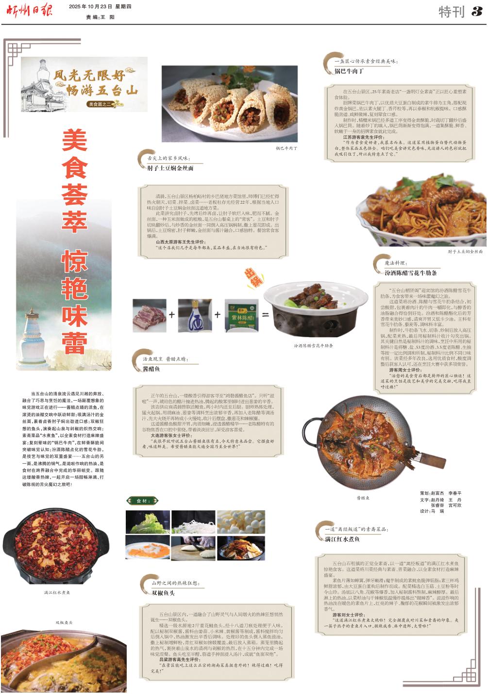當(dāng)五臺(tái)山的清泉流云遇見(jiàn)川湘的奔放、融合了巧思與烹飪的魔法,一場(chǎng)顛覆想象的味覺(jué)游戲正在進(jìn)行——醬醋點(diǎn)睛的活魚(yú),在滾燙的油醋交響中躍動(dòng)鮮甜;吸滿湯汁的金絲面,裹著鹵香肘子燜出勁道口感;雙椒狂想的魚(yú)頭,演奏起山泉與剁椒的熾熱交響;素齋菜品“水煮魚(yú)”,以全素食材打造麻辣盛宴;復(fù)刻葷味的“鍋巴牛肉”,在鮮香酥脆間突破味覺(jué)認(rèn)知;汾酒陳醋點(diǎn)化的雪花牛肋,是技藝與味覺(jué)的雙重盛宴……五臺(tái)山的另一面,是沸騰的鍋氣,是滋啦作響的熱油,是食材在跨界融合中完成的華麗蛻變。跟隨這縷酸香熱辣,一起開(kāi)啟一場(chǎng)酣暢淋漓、打破陳規(guī)的舌尖魔幻之旅吧! 舌尖上的家鄉(xiāng)風(fēng)味:肘子土豆?fàn)F金絲面 清晨,五臺(tái)山景區(qū)楊柏峪村的鄉(xiāng)巴佬地方菜館里,師傅們已經(jīng)忙得熱火朝天,切菜、拌菜、鹵菜……老板杜存光經(jīng)營(yíng)22年,根據(jù)當(dāng)?shù)厝丝谖蹲詣?chuàng)肘子土豆?fàn)F金絲面這道地方菜。 此菜講究鹵肘子,先烤后炸再鹵,讓肘子軟爛入味,肥而不膩。金絲面,一種玉米面做成的粗糧,是五臺(tái)山餐桌上的“??汀?。土豆和肘子切塊翻炒后,與炒香的金絲面一同倒入高壓鍋燜制,撒上蔥花即成。出鍋后,土豆綿密,肘子鮮嫩,金絲面與醬汁融合,口感獨(dú)特。餐館常食客爆滿。 山西太原游客王先生評(píng)價(jià): “這個(gè)店我們幾乎是每年都來(lái),菜品豐盛,在當(dāng)?shù)睾苡刑厣??!?/p> 活魚(yú)現(xiàn)烹醬醋點(diǎn)睛:醬醋魚(yú) 正午的五臺(tái)山,一縷酸香引得游客尋至“鴻磐醬醋魚(yú)店”。只聽(tīng)“滋啦”一聲,琥珀色的醋汁撞進(jìn)熱油,騰起的酸霧里頓時(shí)迸出蔥姜的辛香。 該店供應(yīng)商清晨撈取活鯉魚(yú),兩小時(shí)內(nèi)送至后廚。廚師熟練處理,猛火起鍋,用胡麻油、蔥姜等調(diào)料烹出濃郁辛香,再加入老陳醋等調(diào)湯汁,先大火燒開(kāi)再轉(zhuǎn)成小火慢燉,收汁后擺盤,撒蔥花和辣椒圈。 這道醬醋魚(yú)酸甜開(kāi)胃,肉質(zhì)細(xì)嫩,浸透醬醋精華——老陳醋特有的谷物焦香在口腔中縈繞,帶著淡淡回甘,深受游客喜愛(ài)。 大連游客張女士評(píng)價(jià): “我很早就聽(tīng)說(shuō)五臺(tái)山醬醋魚(yú)很有名,今天特意來(lái)品嘗。它擺盤好看,味道鮮美。希望醬醋魚(yú)能火遍全國(guó)乃至全世界!” 山野之間的熱辣狂想:雙椒魚(yú)頭 五臺(tái)山景區(qū)內(nèi),一道融合了山野靈氣與人間煙火的熱辣狂想悄然誕生——雙椒魚(yú)頭。 精選一級(jí)水源地2斤重花鰱魚(yú)頭,經(jīng)十八道刀痕處理便于入味,配以秘制雙椒醬,醬料由姜蒜、小米辣、黃椒醬等制成,醬料攪拌均勻后倒入鍋中,熱油激發(fā)出辛香后調(diào)味。處理好的魚(yú)頭倒入蒸魚(yú)豉油,撒上秘制增鮮粉,青紅雙椒如錦緞覆蓋,最后放入蒸箱。蒸籠里騰起的熱氣,裹挾著山泉水的清冽與剁椒的熱烈,在十五分鐘內(nèi)完成一場(chǎng)味覺(jué)涅槃。魚(yú)頭吃至半酣,筋道手抻面浸入湯汁,成就“魚(yú)面雙絕”。 呂梁游客高先生評(píng)價(jià): “在景區(qū)能吃上這么正宗的湖南菜真挺意外的!辣得過(guò)癮!吃得完美!” 一盞匠心傳承素食經(jīng)典美味:鍋巴牛肉丁 在五臺(tái)山景區(qū),25年素齋老店“一盞明燈全素齋”正以匠心重塑素食體驗(yàn)。 招牌菜鍋巴牛肉丁,以優(yōu)質(zhì)大豆蛋白制成的素牛排為主角,搭配現(xiàn)炸黃金鍋巴,佐以素火腿丁、香芹粒等,再以泰椒和杭椒提味??诟兴执鄤诺?、咸鮮微辣,復(fù)刻葷食口感。 制作時(shí),精糯米鍋巴經(jīng)多道工序變得金黃酥脆,時(shí)蔬切丁翻炒后盛入鍋巴筒。隨著炒丁的填入,鍋巴筒漸漸變得飽滿,一道集酥脆、鮮香、軟嫩于一身的招牌素食就此完成。 江蘇游客袁先生評(píng)價(jià): “作為素食愛(ài)好者,我慕名而來(lái)。這道菜用植物蛋白替代動(dòng)物蛋白,整體菜品五色俱全。咱們吃美食講究色香味,光這誘人的色彩就把我吸引住了,所以我特意點(diǎn)了它?!?/p> 魔法料理:汾酒陳醋雪花牛肋條 “五臺(tái)山棲賢閣”迎賓館的汾酒陳醋雪花牛肋條,為食客帶來(lái)一場(chǎng)味蕾魔幻之旅。 這道菜將汾酒、陳醋與雪花牛肋條結(jié)合,初嘗酸甜,包裹著肉汁的牛肉一嚼即化,與醇香的油脂融合得恰到好處。汾酒和陳醋酯化后的芳香帶來(lái)美妙口感,清爽開(kāi)胃又低卡少油。主料有雪花牛肋條、藜麥等,調(diào)味料豐富。 制作時(shí),牛肋條飛水、切條、炒制后放入高壓鍋,配菜煮熟,最后用秘制料汁收汁勾芡出鍋。其關(guān)鍵自然是秘制料汁的調(diào)味,烹飪中所用的秘制料汁是將糖、鹽、53度汾酒、3.5度老陳醋、生抽等按一定比例調(diào)和所制,秘制料汁比例不同口味有別。該菜經(jīng)多年改良,選用優(yōu)質(zhì)食材,酸度調(diào)整后獲客人認(rèn)可,還在烹飪大賽中獲多項(xiàng)榮譽(yù)。 游客周女士評(píng)價(jià): “治愈的美食背后都是廚師的匠心獨(dú)運(yùn)!這道菜的烹飪是技藝和美學(xué)的完美交融,吃得我直呼過(guò)癮!” 一道“離經(jīng)叛道”的素齋菜品:滿江紅水煮魚(yú) 五臺(tái)山石咀鎮(zhèn)的正覺(jué)全素齋,以一道“離經(jīng)叛道”的滿江紅水煮魚(yú)驚艷食客。這道菜將川菜經(jīng)典與素齋、晉菜