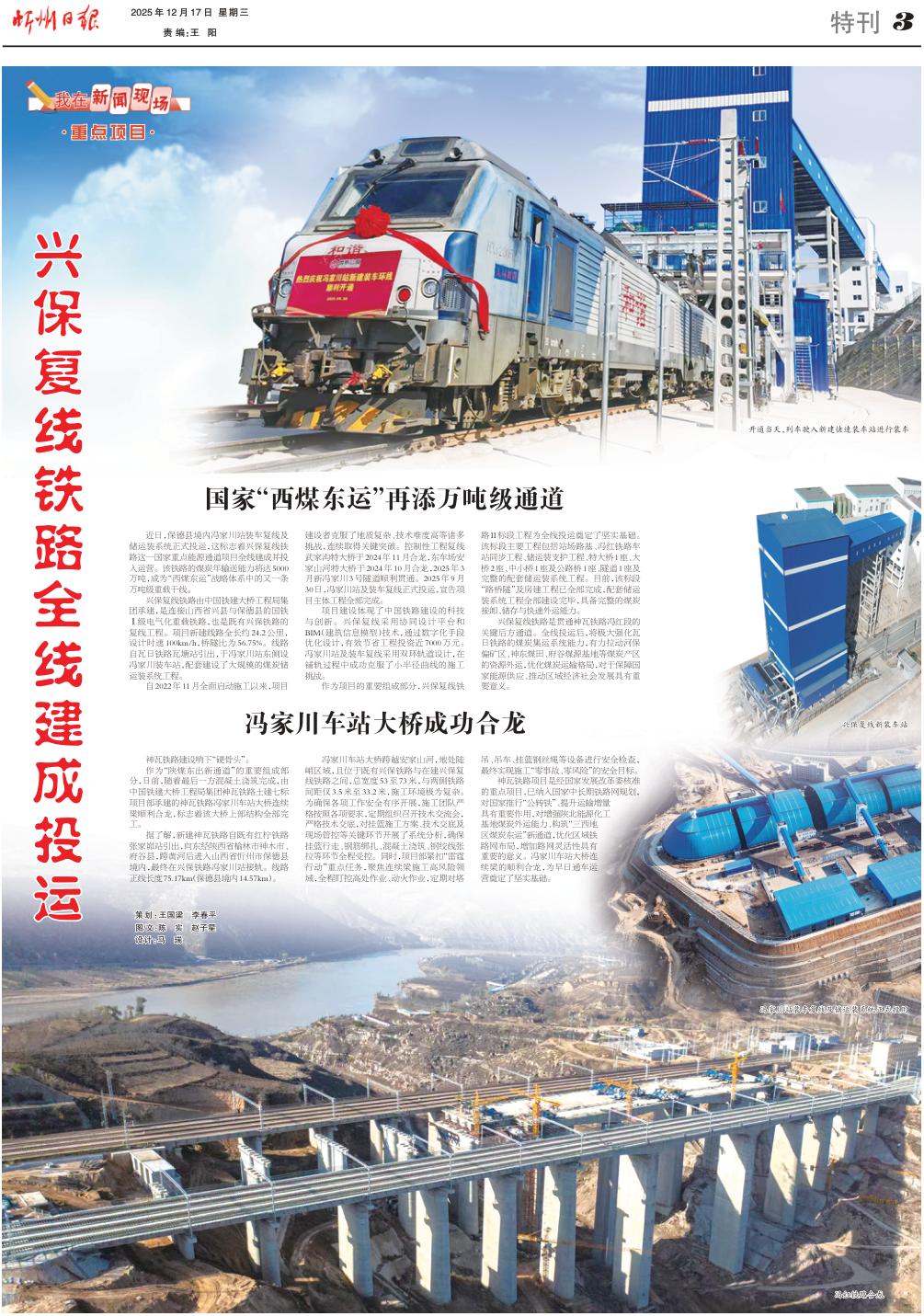 近日,保德縣境內(nèi)馮家川站裝車復(fù)線及儲運裝系統(tǒng)正式投運,這標(biāo)志著興保復(fù)線鐵路這一國家重點能源通道項目全線建成并投入運營。該鐵路的煤炭年輸送能力將達(dá)5000萬噸,成為“西煤東運”戰(zhàn)略體系中的又一條萬噸級重載干線。