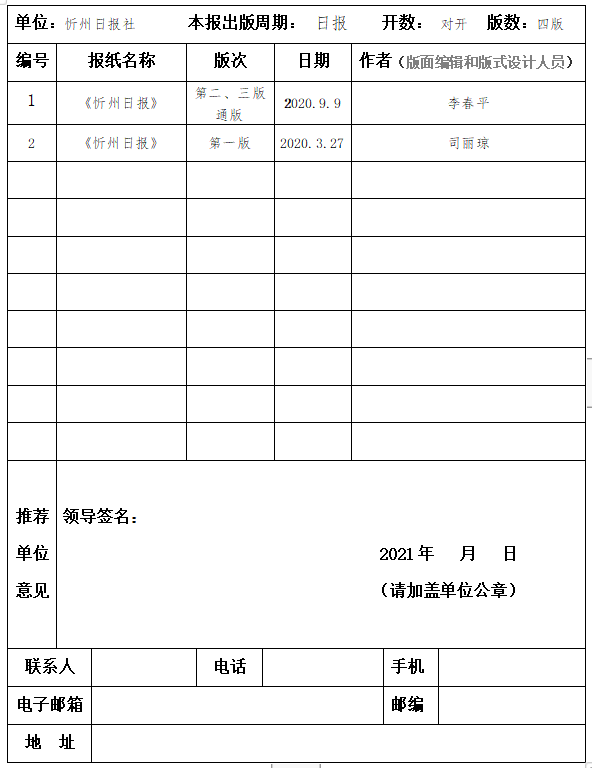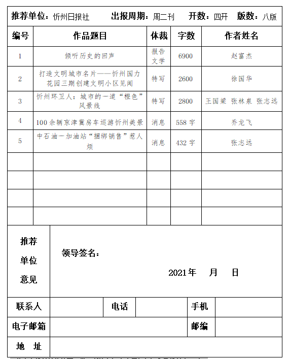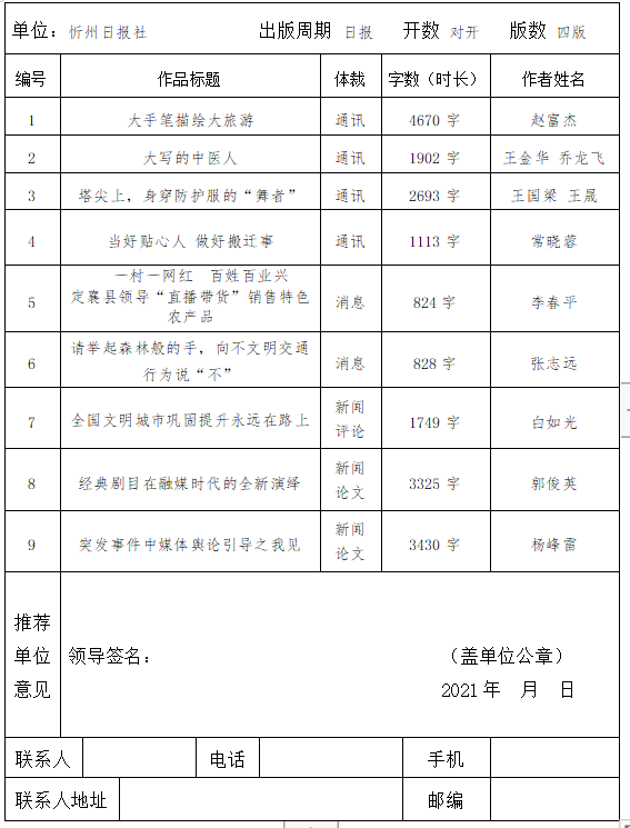 經(jīng)忻州日報社編委會研究決定,以下作品擬推薦申評第三十屆山西新聞獎,現(xiàn)予以公示。有反對意見者,請將反對意見書面報至統(tǒng)籌部。
