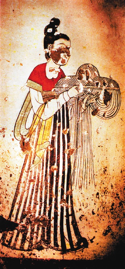 唐燕妃墓捧帷帽侍女壁畫,昭陵博物館藏。1990年,唐太宗的妃子燕氏的墓室被清理出來,墓室壁畫中,宮女手中所捧的帷帽垂掛著一圈長(zhǎng)絲穗,形成一道薄幕,有一定衛(wèi)生防護(hù)功能。
