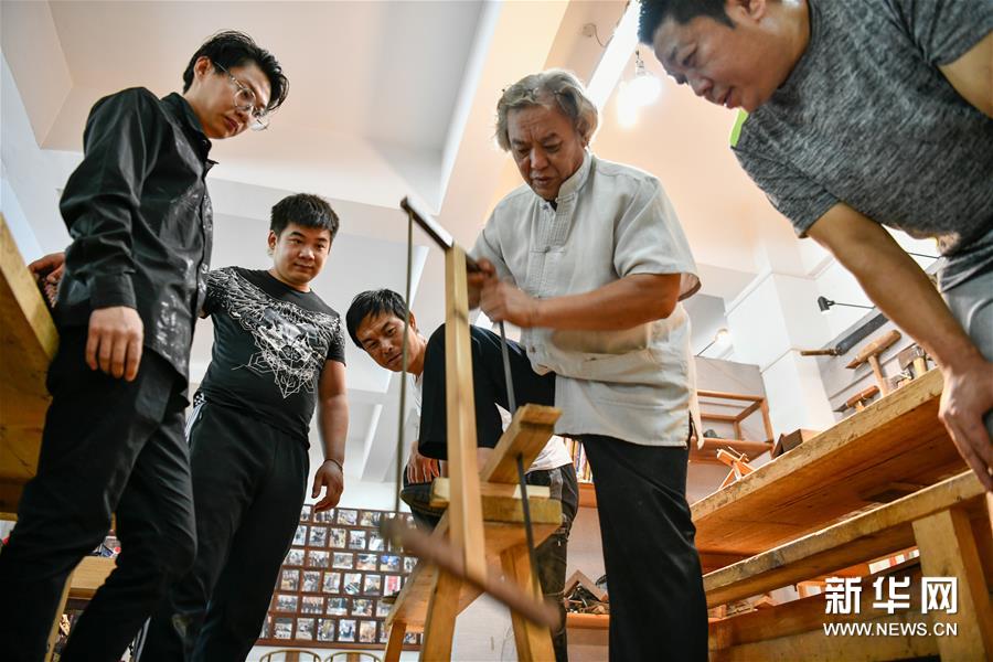 8月25日,在天津職業(yè)大學(xué)辛全生大師木藝工作室,辛全生(右二)給徒弟們演示開料流程。新華社發(fā)(孫凡越 攝)
