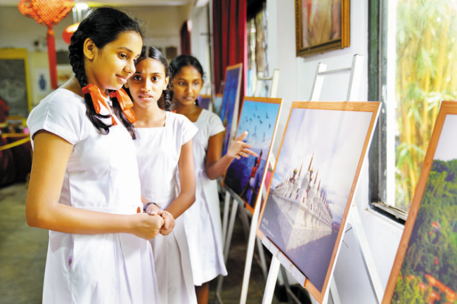 9月29日,在斯里蘭卡首都科倫坡的總統(tǒng)女子學(xué)校小禮堂,學(xué)生們觀看展出的中國(guó)四川風(fēng)光攝影作品。新華社記者 唐 璐 攝