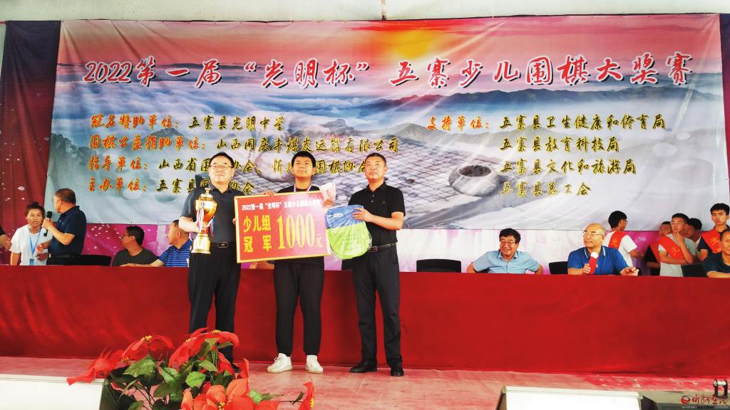 這次大獎賽由五寨縣圍棋協(xié)會主辦,五寨縣光明中學(xué)冠名贊助,山西同慶豐煤炭運銷有限公司贊助支持。開幕式上,山西省圍棋協(xié)會向五寨縣圍棋協(xié)會捐贈了價值8500元的智能一體機一臺,忻州市圍棋協(xié)會向五寨縣圍棋協(xié)會頒發(fā)了“立足五寨沃土,培養(yǎng)圍棋人才”的獎牌,并捐贈了價值7200元的高檔圍棋凳40個。山西省圍棋協(xié)會向五寨縣光明中學(xué)捐贈國學(xué)經(jīng)典書籍一套,山西人民出版社社長姚軍(圍棋5段)向大賽組委會贈送書法作品一幅。