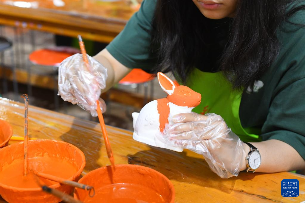 6月6日,一名體驗(yàn)者在唐三彩文化研學(xué)所為唐三彩素胎施釉。