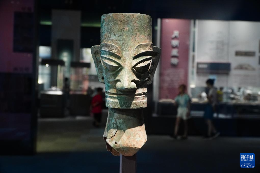 成果展上展出的四川省文物考古研究院藏四川廣漢三星堆遺址出土銅人頭像(7月12日攝)。