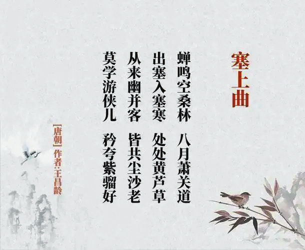 《塞上曲》唐(王昌齡):“蟬鳴空桑林,八月蕭關道。出塞入塞寒,處處黃蘆草。從來幽并客,皆共塵沙老。莫學游俠兒,矜夸紫騮好?!痹娭械娜?、塞下,說穿了就是關外和關內。但,其實景象沒什么特別,黃云、風沙、駿馬、朔雪、美酒、桑林、關道、蘆草、沙場,也似乎只有這些才能更符合邊塞詩人的審美。而“雁門關”成了李頎、王昌齡這對好友的共同命題。