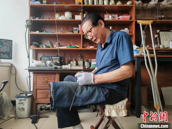 王圣良告訴記者,小時候他因為生病,腿腳落下了殘疾,別的兄弟姐妹出去玩,他就跟著爺爺學(xué)習(xí)錫雕。“做錫雕需要心靜、身靜,因為行走不方便,我比其他人更坐得住,在學(xué)習(xí)錫雕上更有‘優(yōu)勢’”。
