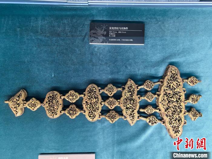 4月9日,金龍巧牽京藏情——《高原中華龍》主題展覽在北京西藏文化博物館開幕。圖為展品雙龍獸紋馬具飾件。中新網(wǎng)記者 劉玥晴 攝
