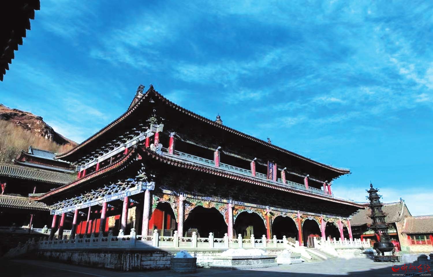 經(jīng)過(guò)懸掛著“金閣浮空”匾額的木牌坊,沿著108級(jí)漢白玉石臺(tái)階拾級(jí)而上,山門處沉靜肅穆。放慢腳步,深深呼吸,感受空氣的清新與純凈,感受獨(dú)有的靜謐與祥和。走進(jìn)寺內(nèi),仿佛穿越時(shí)空,抵達(dá)一個(gè)與世隔絕的佛國(guó)世界。