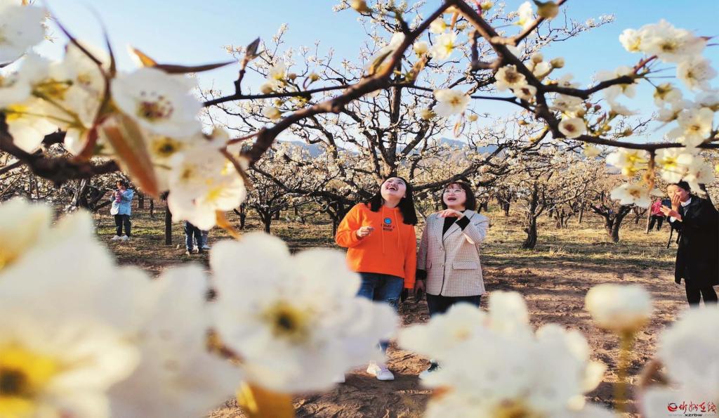 游客沉醉在同川梨花園中 宮清華 攝