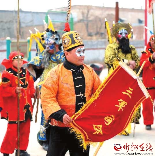 令人欣喜的是,今年的社火表演增加了很多新鮮血液,最小的表演者只有11歲。72歲的社火老藝人梁生偉是總教練,第十四代傳承人李軍平是演員兼教練。在他們帶領(lǐng)下,每一次演出從召集、化妝、著裝、配飾、道具,到列隊(duì)、祭旗、出征、行軍,以及演出中的傳丁、練兵、探馬、布陣、對(duì)壘、決戰(zhàn)、破陣等,每一個(gè)細(xì)節(jié)都有講究、說(shuō)法和規(guī)矩。其行為規(guī)范貫穿著樸素的古代儒家哲學(xué)思想,其陣法擺出的是玄妙的古代軍事戰(zhàn)陣,如對(duì)打表演的是北宋楊繼業(yè)楊家軍的武術(shù)套路,鼓樂(lè)擊打出的是原始戰(zhàn)鼓石破天驚的鼓點(diǎn)風(fēng)格,給人以極大的歷史韻味和藝術(shù)享受。