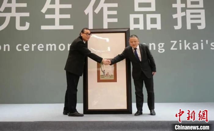 中國國家畫院院長劉萬鳴(左)接受豐子愷家屬捐贈的豐子愷國畫作品。 中國國家畫院供圖