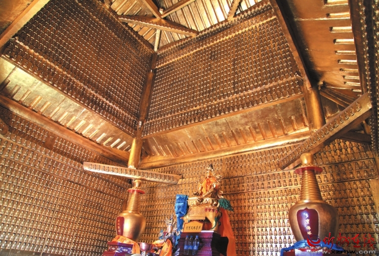 隔扇外壁鑄有36幅花卉圖案,有二龍戲珠、魚躍龍門、犀牛望月、玉兔拜月等,構(gòu)圖清晰,形象生動。殿內(nèi)四壁滿鑄小佛,號稱萬佛,佛像形態(tài)各異,栩栩如生。殿內(nèi)正中供奉著一尊高達(dá)1米的銅鑄文殊騎獅像,其鑄藝高超,神態(tài)逼真,體態(tài)閑適,是明代銅鑄佛像之珍品。