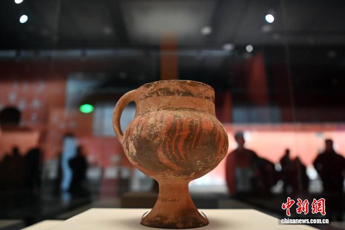 圖為觀眾參觀展出的漩渦紋四鋬雙耳彩陶罐。九美旦增 攝