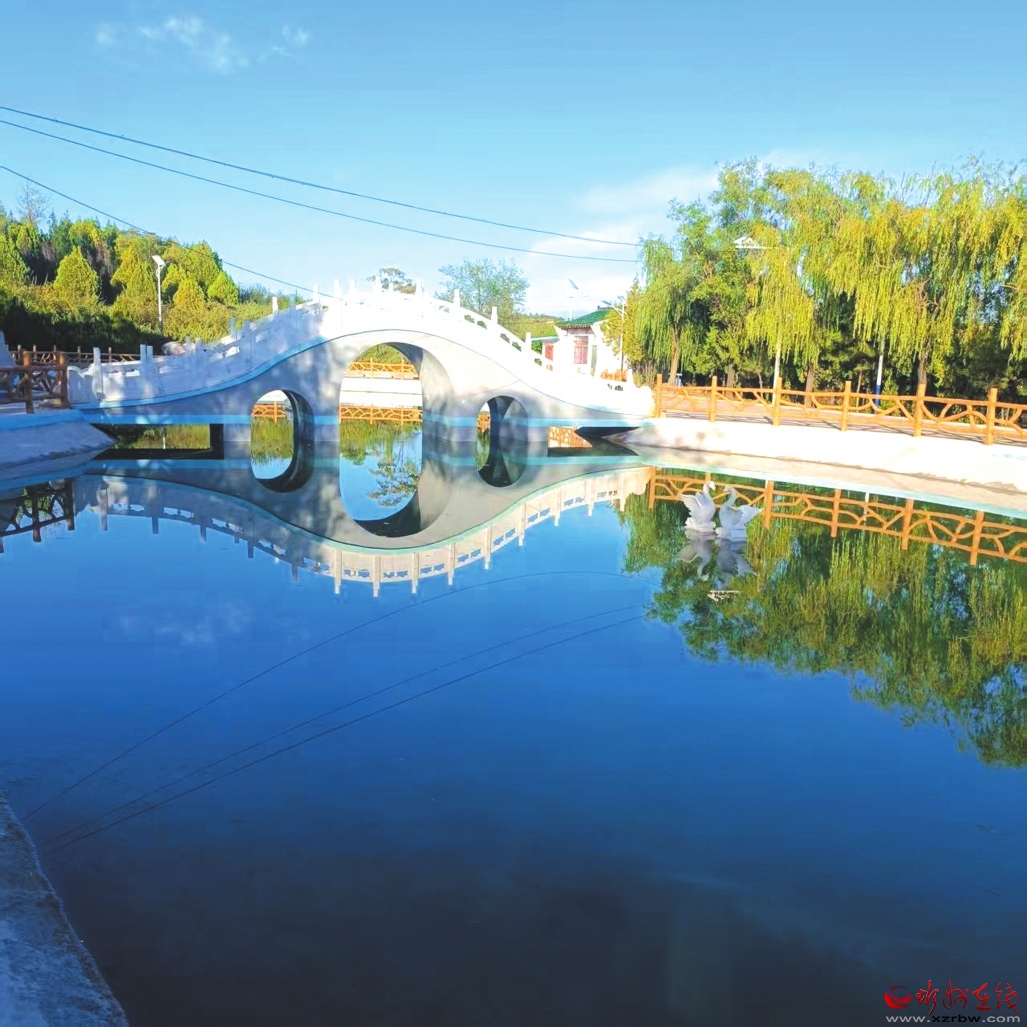 沿路而下,過橋爬坡,便到了天鵝湖。誰能想到,這碧水涵虛的景致,原是當(dāng)年造林蓄水的大水坑?工程完工后順勢修整,竟成飛龍山又一勝景。天鵝湖呈葫蘆狀,漢白玉拱橋橫跨腰間如玉帶,橋東石雕飛龍昂首欲飛,橋西石雕雙鵝戲水憨萌。湖水清澈見底,倒映藍(lán)天白云綠樹,風(fēng)過時(shí)漣漪擴(kuò)散,美得讓人心醉,連時(shí)間都慢了下來。