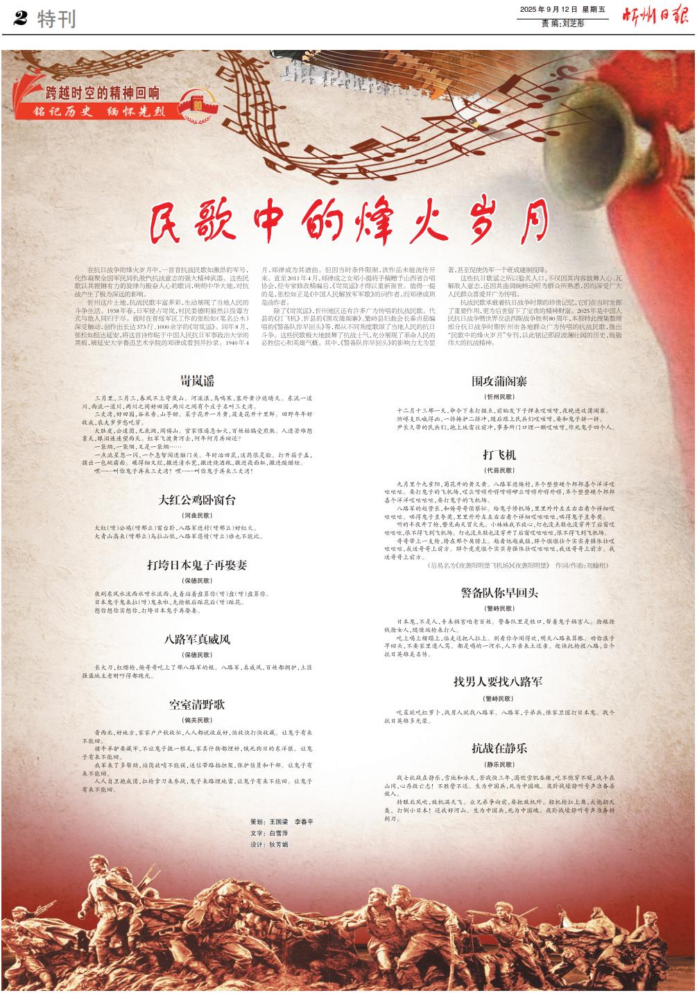 抗戰(zhàn)民歌承載著抗日戰(zhàn)爭(zhēng)時(shí)期的珍貴記憶,它們?cè)诋?dāng)時(shí)發(fā)揮了重要作用,更為后世留下了寶貴的精神財(cái)富。2025年是中國(guó)人民抗日戰(zhàn)爭(zhēng)暨世界反法西斯戰(zhàn)爭(zhēng)勝利80周年,本報(bào)特此搜集整理部分抗日戰(zhàn)爭(zhēng)時(shí)期忻州市各地群眾廣為傳唱的抗戰(zhàn)民歌,推出“民歌中的烽火歲月”???,以此銘記那段波瀾壯闊的歷史,致敬偉大的抗戰(zhàn)精神。