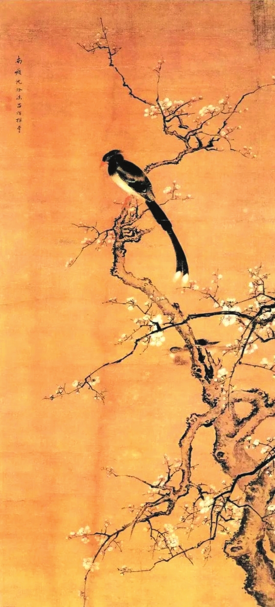 宋代畫家筆下的梅花大都與禽鳥有所關(guān)聯(lián),這主要得益于花鳥畫在此時(shí)的繁盛之勢(shì)。宋徽宗趙佶的《臘梅山禽圖》就把梅花與白頭翁聯(lián)系起來,描繪了在乍暖還寒的季節(jié)里,兩只相伴而生的白頭翁立于臘梅枝頭的場(chǎng)景,給觀者帶來復(fù)蘇之感。作品左下角題詩“山禽矜逸態(tài),梅粉弄輕柔。已有丹青約,千秋指白頭”,表達(dá)了愛情之思。因?yàn)榘最^翁在傳統(tǒng)文化中象征吉祥與幸福,是對(duì)白頭偕老的隱喻,當(dāng)它與梅花結(jié)合起來時(shí),便會(huì)強(qiáng)化人們對(duì)美好愛情的聯(lián)想。