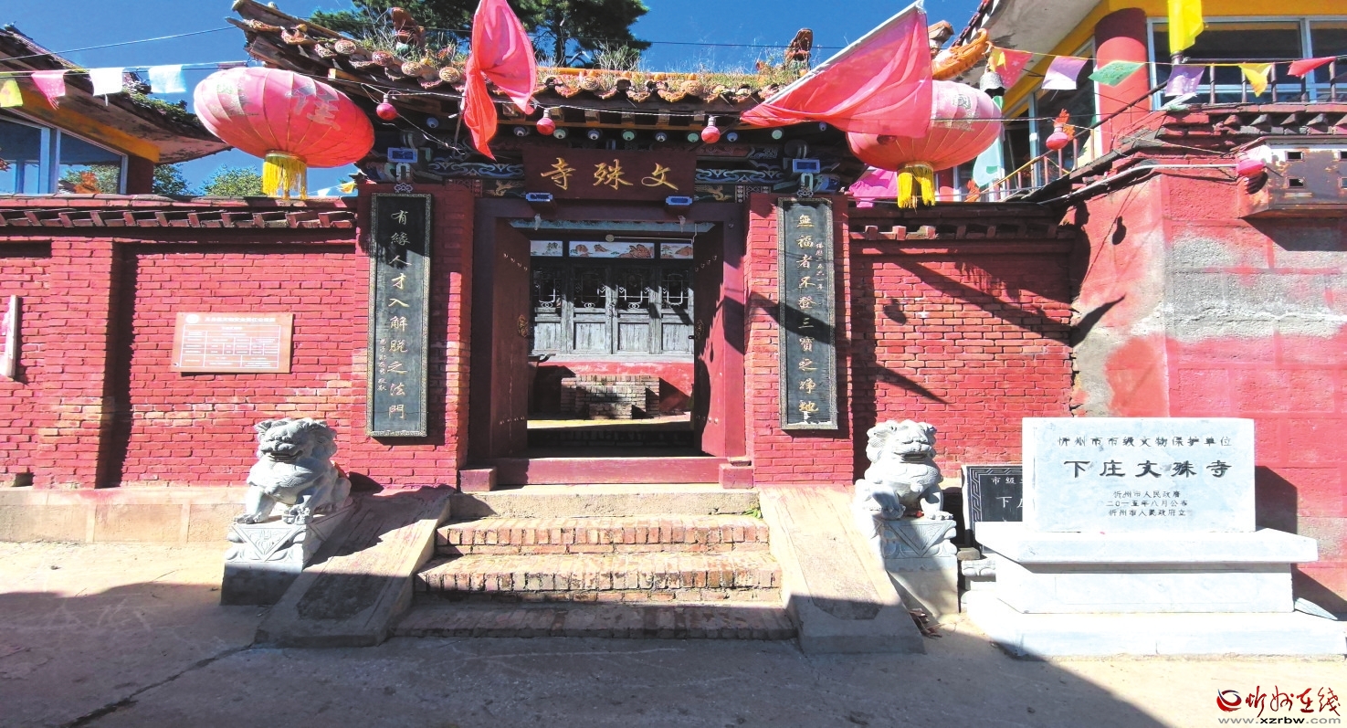 下莊文殊寺位于五臺縣東雷鄉(xiāng)下莊村中,始創(chuàng)年代不詳,現(xiàn)存建筑為明代所建。寺廟坐北向南,占地面積368平方米。山門一間,中置板門。正殿面寬三間、進(jìn)深五椽,前出廊(此走廊屬清代遺構(gòu),為后期加接),廊柱施斗拱,大斗口內(nèi)出跳,兩側(cè)帶有雕花翼拱。檐柱頭斗拱為五踩,其下昂已被鋸掉(現(xiàn)存昂嘴為清代更換的如意昂式);平身科斗拱亦為五踩。當(dāng)心間設(shè)門,兩次間設(shè)直欞窗。