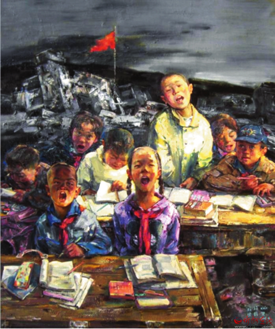 同樣表現(xiàn)地震題材的另一幅作品《震后復(fù)課》則展示出另外一種浪漫情懷,發(fā)人深省,令人感慨萬(wàn)千。在尚未處理完畢的地震廢墟上,孩子們真誠(chéng)地開始了希望的追求,展示著大震壓不垮的人性力量和災(zāi)后最具震撼力的希望。是的,紅旗在哪里,精神支撐就在哪里。孩子是希望,是未來。在孩子們的臉上,沒有恐懼和悲哀,沒有茫然與無(wú)助,有的只是對(duì)知識(shí)的渴望,對(duì)未來的憧憬。一個(gè)角落的復(fù)課場(chǎng)景,映射著中華民族偉大復(fù)興的精神力量。 邢晨聲 文