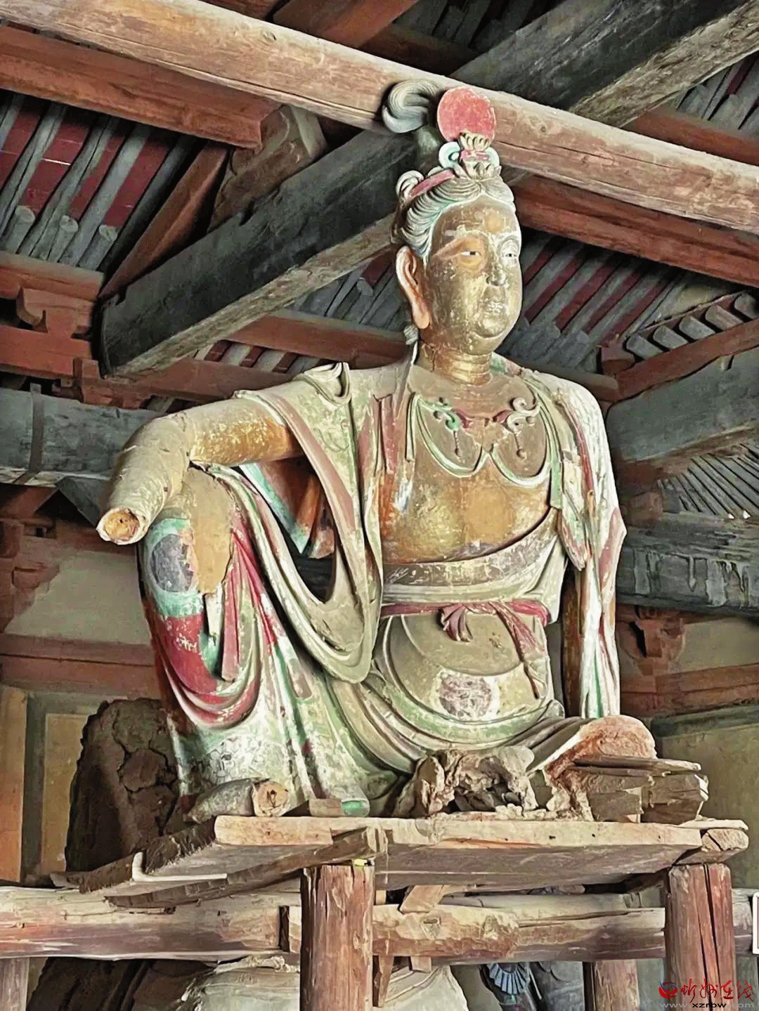 巖山寺坐北朝南,平面呈不規(guī)則長方形。寺內(nèi)正殿已毀,現(xiàn)存建筑主要有文殊殿、伽藍殿、地藏殿、馬王殿等。其中,文殊殿面闊五間,進深六椽,單檐歇山頂。殿內(nèi)保存有金代彩塑水月觀音、脅侍、天王和文殊坐騎等。水月觀音面額豐腴,衣帶飄灑,若乘風翩翩欲飛。