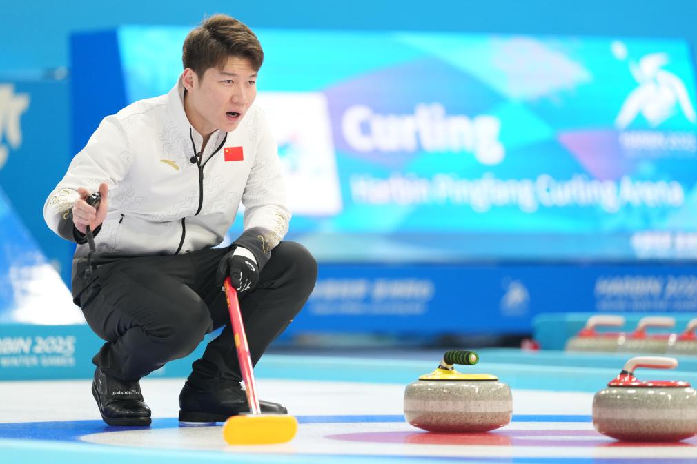 2月6日,中國隊(duì)選手王智宇在比賽中指揮隊(duì)友擦冰。當(dāng)日,在哈爾濱舉行的第九屆亞冬會冰壺混雙循環(huán)賽B組第6輪比賽中,中國隊(duì)6比4戰(zhàn)勝韓國隊(duì)。新華社記者 王松 攝