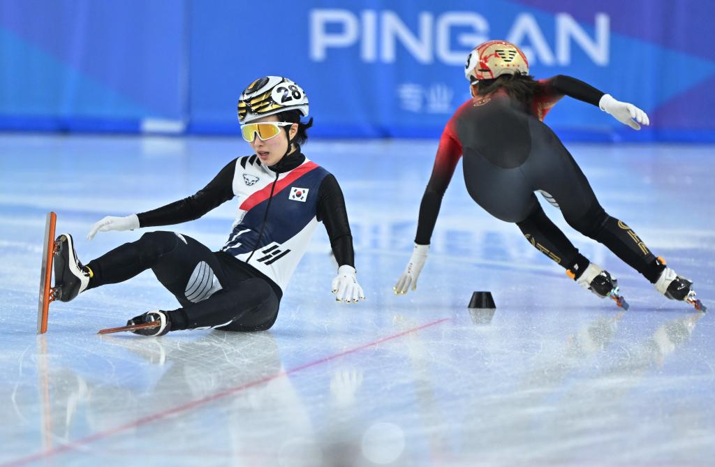 2月9日,中國隊選手公俐(右)在比賽中沖刺,韓國隊選手金吉莉在比賽中摔倒。新華社記者 江漢 攝