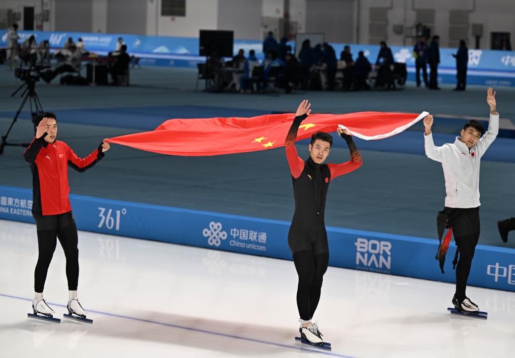 黑龍江省冰上訓練中心速滑館里,《義勇軍進行曲》三度奏響。當日速度滑冰全部3枚金牌均被中國隊收入囊中。高亭宇先以0.02秒的微弱優(yōu)勢力壓日本選手森重航,奪得男子500米冠軍;又與隊友廉子文、寧忠?guī)r合作,奪得男子短距離團體追逐金牌。女隊則又一次讓三面五星紅旗同時升起,楊濱瑜、韓梅、太智恩分獲女子3000米前三名。本屆亞冬會有三金入賬的高亭宇坦言不知道這會不會是自己最后一屆亞冬會,“(這次)我的關鍵詞是努力,相信大家一起努力,中國速度滑冰會越來越好”。