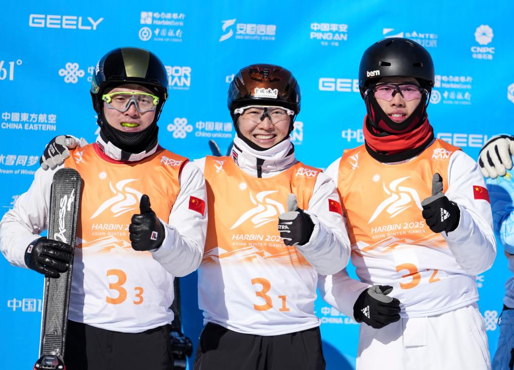 2月10日,齊廣璞、徐夢桃和李心鵬(從左至右)在賽后合影。當日,在亞布力舉行的第九屆亞冬會自由式滑雪空中技巧混合團體決賽中,中國隊奪冠。新華社記者 賴向東 攝