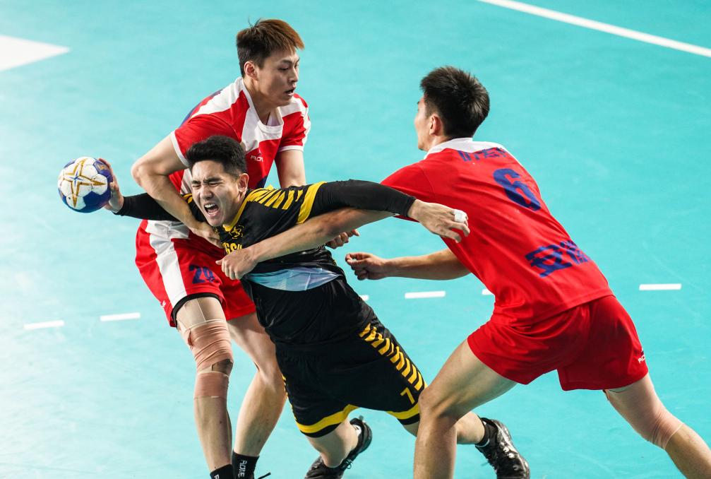 19日,中國(guó)男子手球超級(jí)聯(lián)賽遷安賽區(qū)江蘇隊(duì)(黑)與安徽隊(duì)(紅)在比賽中。