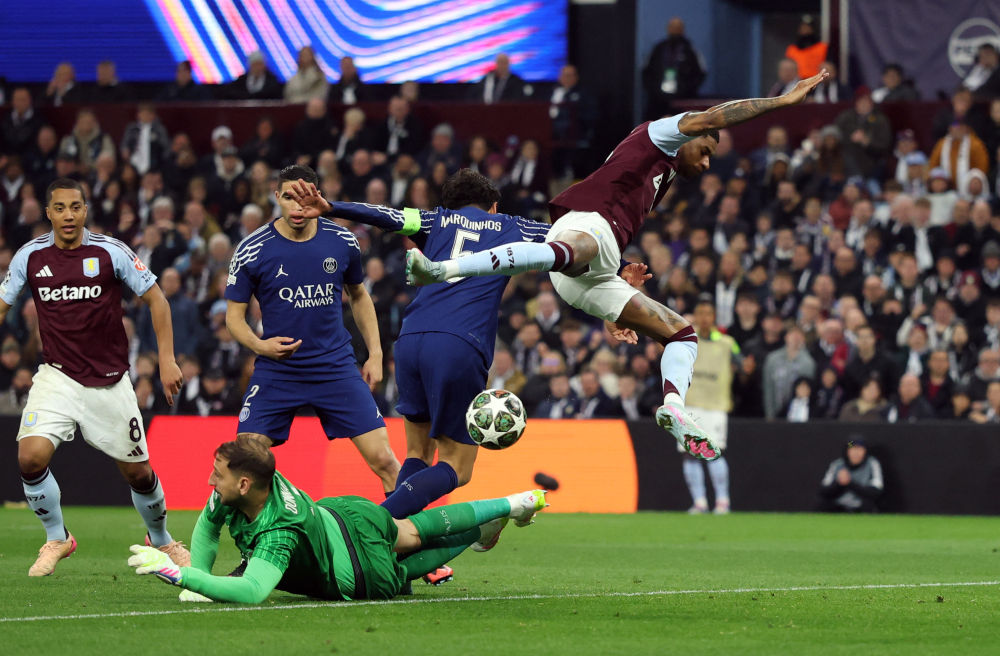 在維拉公園球場(chǎng)的雨戰(zhàn)中,首回合主場(chǎng)3:1勝出的巴黎圣日耳曼先聲奪人。第11分鐘,登貝萊左路突破后橫傳門(mén)前,維拉門(mén)將馬丁內(nèi)斯撲球失誤,阿什拉夫抓住機(jī)會(huì)勁射破網(wǎng)?!按蟀屠琛痹诘?7分鐘打出高效反擊,登貝萊助攻左后衛(wèi)門(mén)德斯低射命中,將領(lǐng)先優(yōu)勢(shì)擴(kuò)大為2:0。