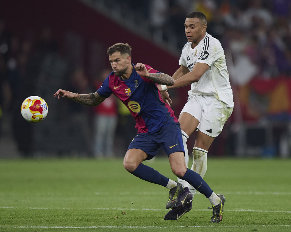 4月26日,巴塞羅那隊(duì)球員伊尼戈·馬丁內(nèi)斯(左)和皇家馬德里隊(duì)球員姆巴佩在比賽中拼搶。新華社發(fā)(帕布羅·莫拉諾 攝)