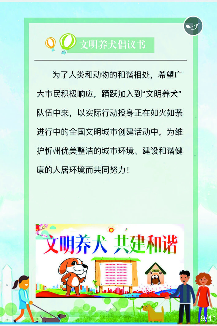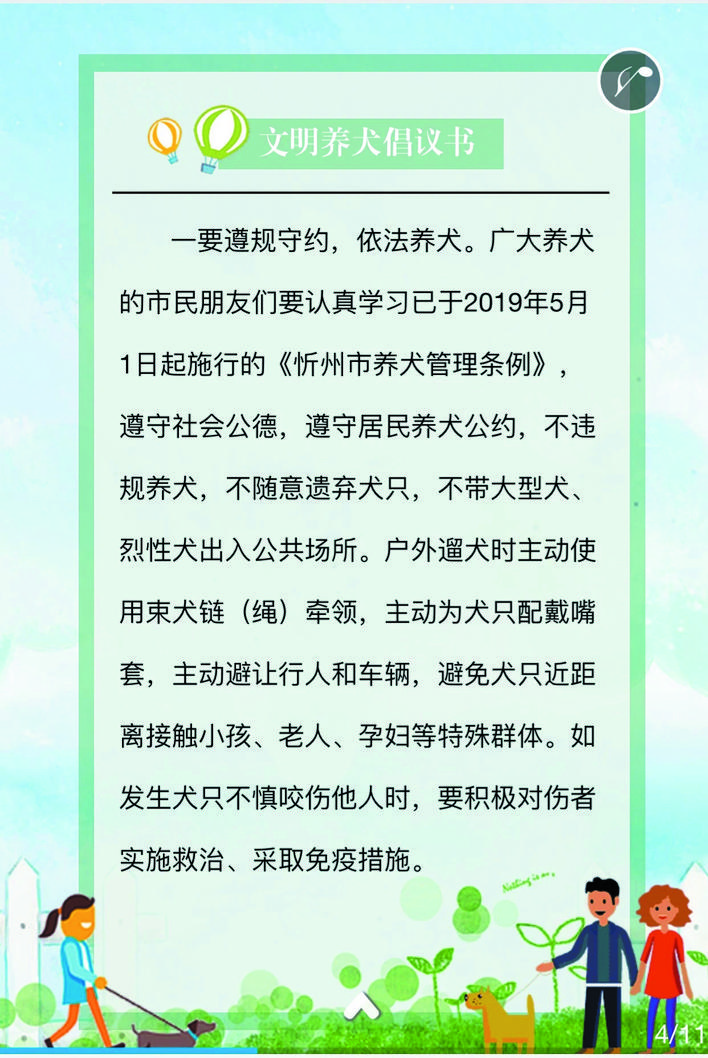 文明養(yǎng)犬,從我做起。讓我們共同努力,心往一處想、勁往一處使,為忻州這座千年之城戴上熠熠閃光的文明桂冠。(魯明強(qiáng) 常曉蓉)