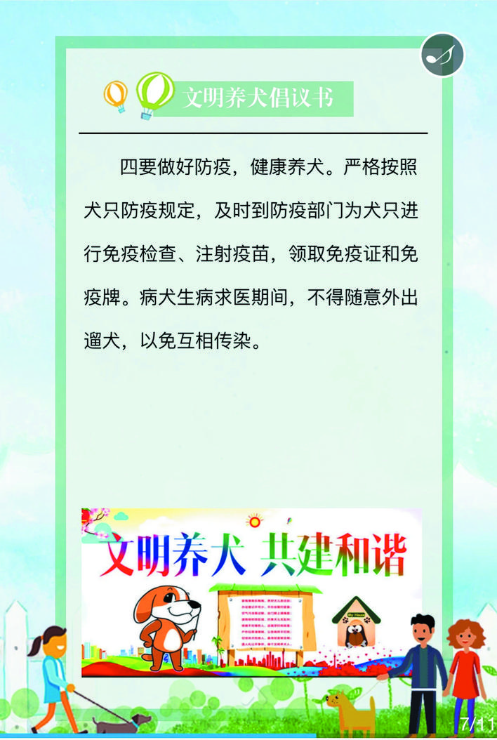 在宣傳活動中,民警深入街道、小區(qū)、商鋪等人員密集場所,在宣傳欄懸掛文明養(yǎng)犬宣傳標(biāo)語、張貼文明養(yǎng)犬倡議書等宣傳資料,向轄區(qū)居民詳細(xì)講解《忻州市養(yǎng)犬管理?xiàng)l例》《文明養(yǎng)犬公告》的具體內(nèi)容,引導(dǎo)養(yǎng)犬群眾主動辦理養(yǎng)犬登記證、出門為犬只佩戴犬牌、定期為犬只注射疫苗,做到依法養(yǎng)犬、文明養(yǎng)犬、衛(wèi)生養(yǎng)犬、健康養(yǎng)犬、安全養(yǎng)犬。活動中,該局共懸掛宣傳標(biāo)語50條,張貼文明養(yǎng)犬倡議書500份,向群眾發(fā)放宣傳資料3500人/份。