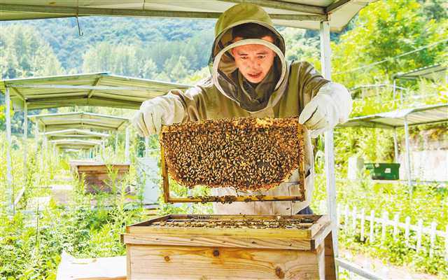 今年4月,重慶市石柱縣中益鄉(xiāng)鹽井村,蜜蜂的嗡鳴聲奏響了致富交響曲。自從中益鄉(xiāng)發(fā)展了電商平臺,陳小平的蜂蜜生意越來越紅火。“六月底交付了這500群蜂種,今年就能再增收25萬元?!丙}井村蜂農(nóng)陳小平說。2016年開始養(yǎng)蜂至今,陳小平的蜜蜂已經(jīng)從最初的30多群逐年擴(kuò)增至如今的300多群,2019年,2000斤的蜂蜜產(chǎn)量為他帶來20萬元的收入。