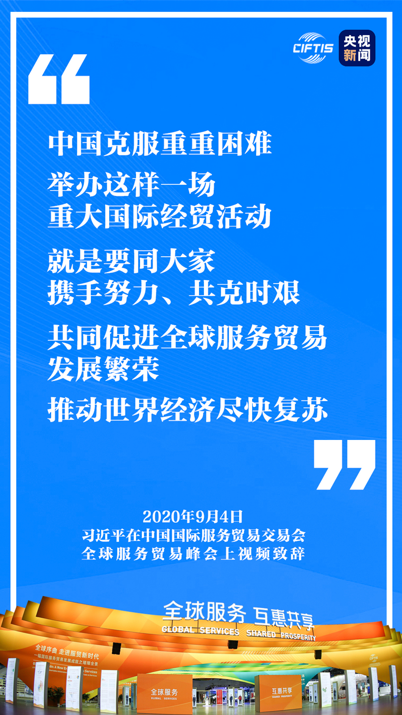 中國克服重重困難,舉辦這樣一場重大國際經(jīng)貿(mào)活動,就是要同大家攜手努力、共克時艱,共同促進全球服務貿(mào)易發(fā)展繁榮,推動世界經(jīng)濟盡快復蘇。