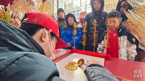 總書記察看街區(qū)風(fēng)貌和各式年貨攤位,同現(xiàn)場群眾親切交流。他愉快地向大家講起年少時多次到隆福寺的情景,還購買了特色食品和文創(chuàng)產(chǎn)品。